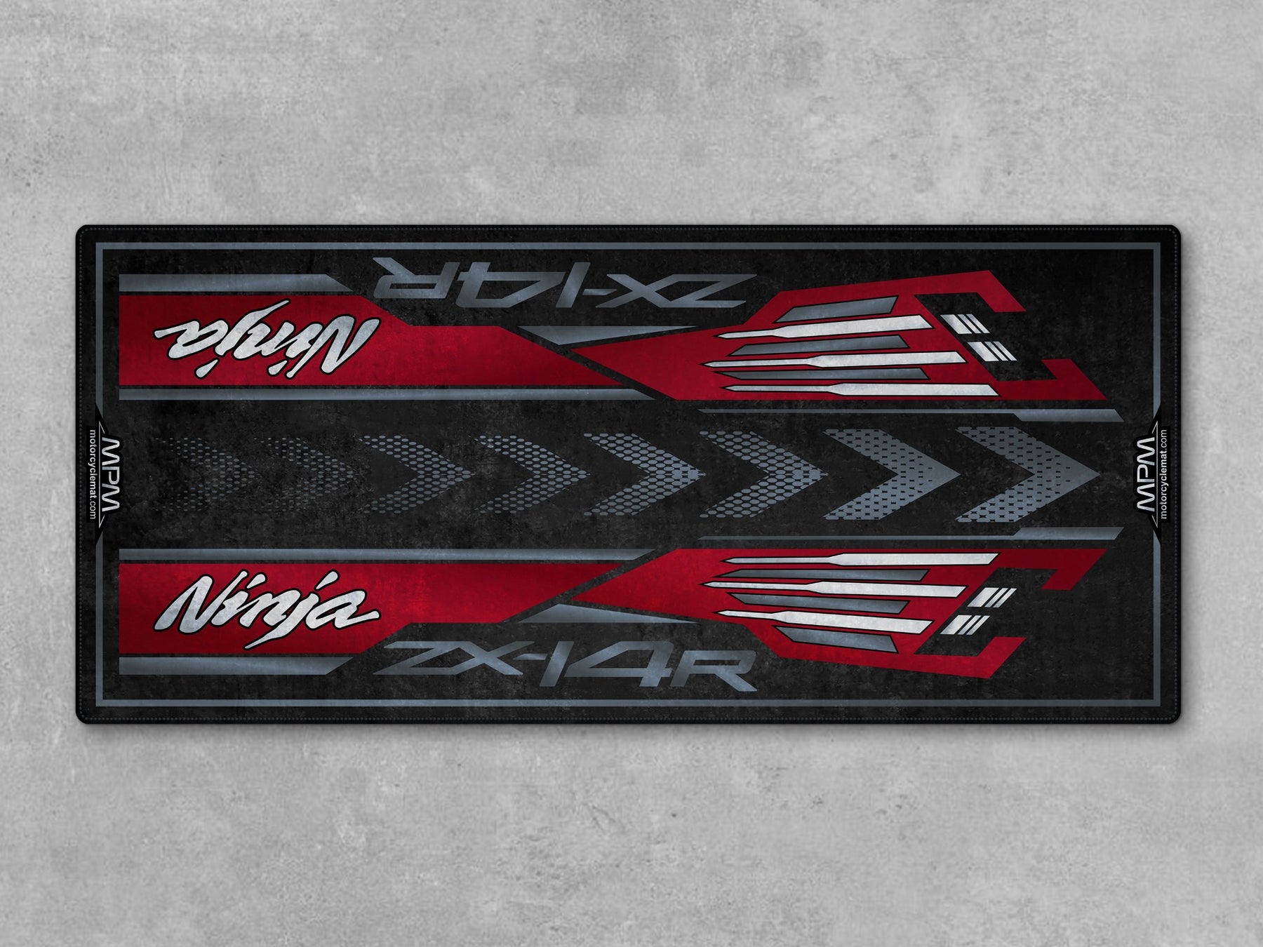 Kawasaki ZX-14R kişiselleştirilmiş pit halısı, motorcu hediye ve sürüş ekipmanları için şık paspas