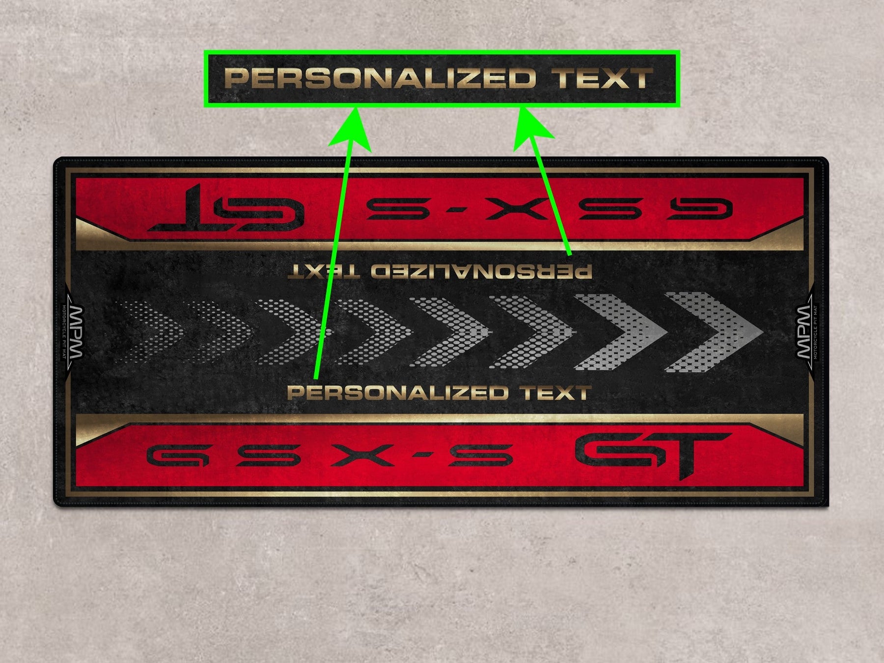Kişiselleştirilmiş Suzuki GSX-S1000 GT pit matı, showroom halısı ve yarış hazırlığı için